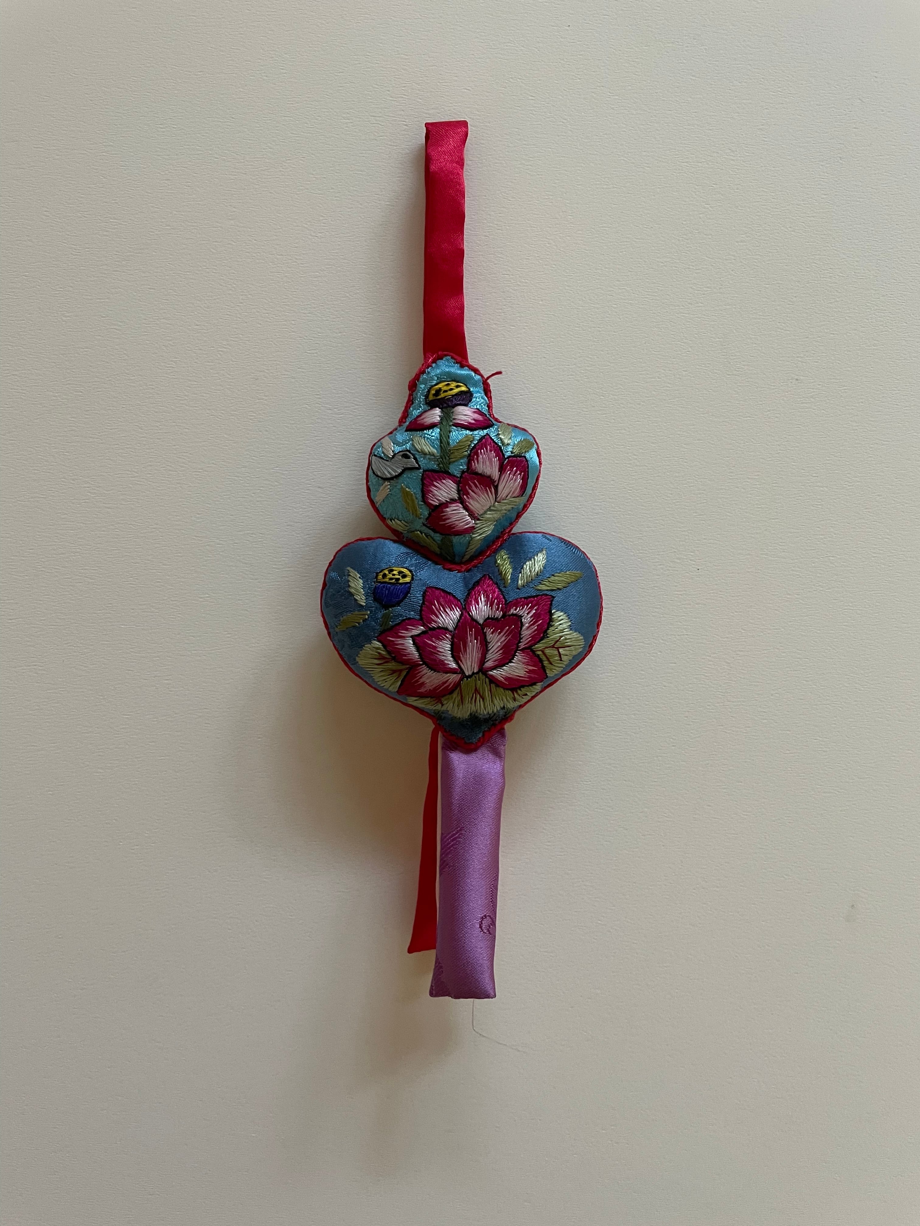 手作りの針山です。光沢のある布地に愛らしい草花や鳥の手刺繍が施されています。アンティークではなく現代の品です。針山としてはもちろん、そのままデコレーションとして、あるいはストラップなどに付けたりしてお楽しみください。
